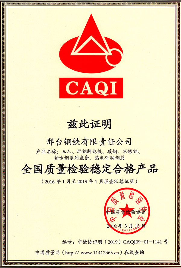 The pure iron, carbon steel, stainless steel, wire rod for bearing and the hot rolled ribbed steel bar of Three Person Brand was awarded the Products with Excellent Quality Stablility in China.