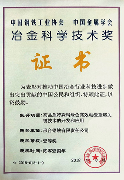 The project of “Development and application of the key technology of green and efficient electroslag remelting of high-quality special steel” which is jointly participated by Xingtai Steel won the first prize of National Science & Technology Progress Award.