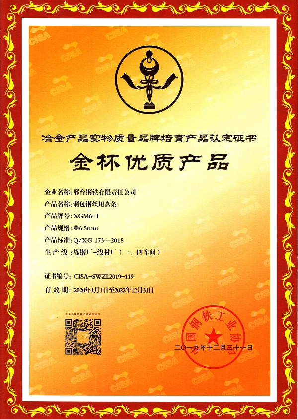 The φ6.5mm wire XGM6-1 for copper weld wire rod obtained the quality certificate of Gold Cup Quality Products for Metallurgical Products