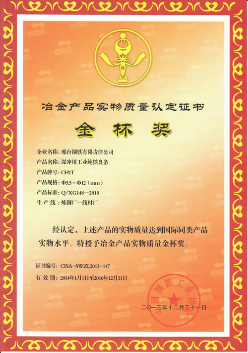 The φ5.5~16mm wire GCr15 for bearing awarded the Gold Cup Prize for Metallurgy products.
