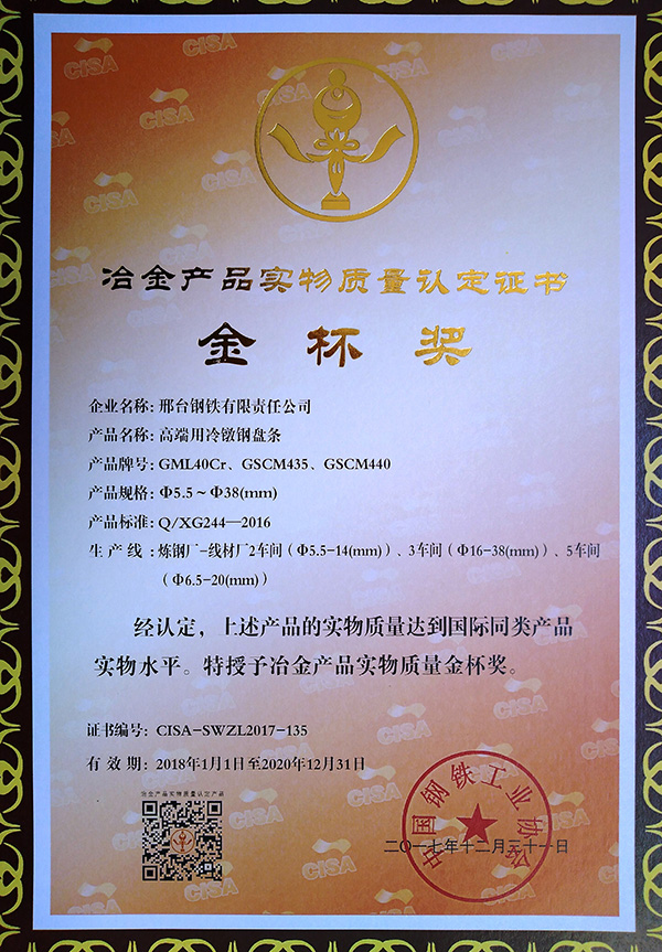 高端用冷鐓鋼盤條GML40Cr、GSCM435、GSCM440Φ5.5~Φ38(mm)獲冶金產(chǎn)品實(shí)物質(zhì)量金杯獎(jiǎng)