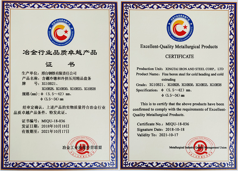 含硼冷鐓和冷擠壓用精品盤條XG10B21φ5.5-42mm規(guī)格和XG10B28/XG10B30/XG10B33 /XG10B38φ5.5- 34mm規(guī)格,獲冶金行業(yè)品質(zhì)卓越產(chǎn)品。