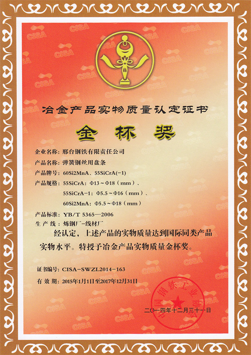 彈簧鋼絲用盤(pán)條60Si2MnA、55SiCrA(-1)獲冶金產(chǎn)品實(shí)物質(zhì)量金杯獎(jiǎng)