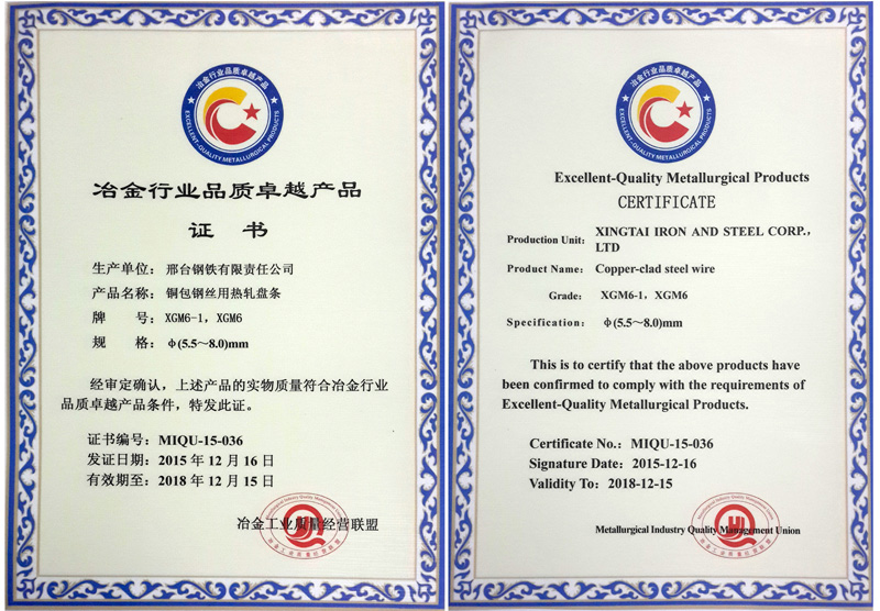銅包鋼絲用熱軋盤(pán)條XGM6-1、XGM6φ(5.5~8.0)mm獲冶金行業(yè)品質(zhì)卓越產(chǎn)品