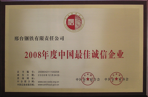 2008年12月,邢鋼榮獲由中國企業(yè)聯(lián)合會、中國企業(yè)家協(xié)會頒發(fā)的2008年度“中國最佳誠信企業(yè)”榮譽稱號。