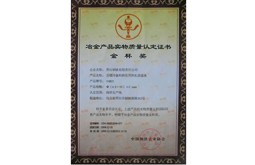 2008年12月31日,邢鋼含硼冷鐓和冷擠壓用鋼盤條10B21獲冶金產(chǎn)品實物質(zhì)量金杯獎。