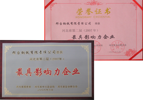 2008年6月,邢鋼榮獲由河北省國資委、河北省中小企業(yè)局、河北省企業(yè)聯(lián)合會頒發(fā)的“河北省第二屆最具影響力企業(yè)”榮譽稱號。