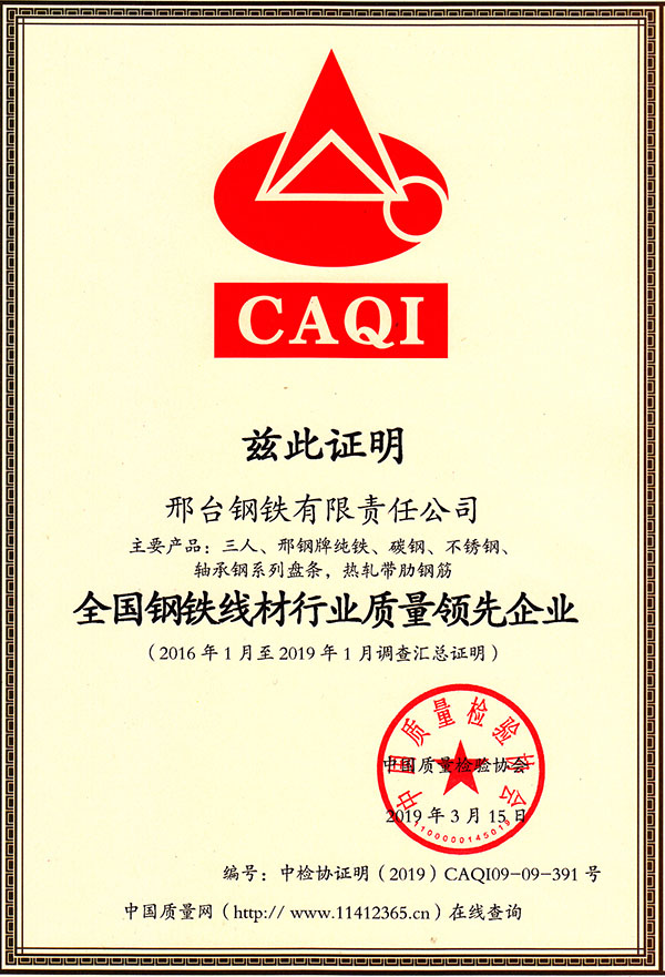 2019年3月15日,邢鋼(主要產(chǎn)品:三人、邢鋼牌純鐵、碳鋼、不銹鋼、軸承鋼系列盤條,熱軋帶肋鋼筋),被中國(guó)質(zhì)量檢驗(yàn)協(xié)會(huì)授予“全國(guó)鋼鐵線材行業(yè)質(zhì)量領(lǐng)先企業(yè)”稱號(hào)。