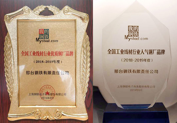 2019年6月12日,2019 Mysteel全國(guó)工業(yè)線材暨緊固件產(chǎn)業(yè)鏈高峰論壇在上海舉行。論壇會(huì)上,組委會(huì)根據(jù)國(guó)內(nèi)工業(yè)線材生產(chǎn)企業(yè)品牌、質(zhì)量表現(xiàn)、市場(chǎng)反饋、網(wǎng)絡(luò)投票等多個(gè)環(huán)節(jié)的評(píng)比結(jié)果,評(píng)選出2018-2019年度“全國(guó)工業(yè)線材行業(yè)優(yōu)質(zhì)鋼廠品牌”和“全國(guó)工業(yè)線材行業(yè)人氣鋼廠品牌”,并頒發(fā)了獎(jiǎng)牌和獎(jiǎng)杯。邢鋼榮獲此兩項(xiàng)榮譽(yù)稱號(hào)。