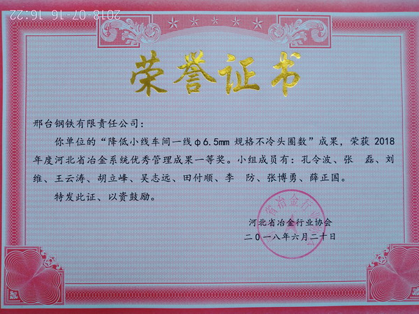 河北省冶金行業(yè)協(xié)會于6月份在秦皇島召開了“全省冶金行業(yè)質量管理優(yōu)秀成功發(fā)布會”,邢鋼線材廠小線車間工藝技術QC小組《降低小線車間一線6.5mm規(guī)格不冷頭圈數(shù)》在發(fā)布會上進行了成功發(fā)布,獲得本次發(fā)布會一等獎的好成績。