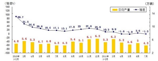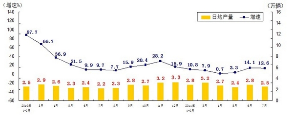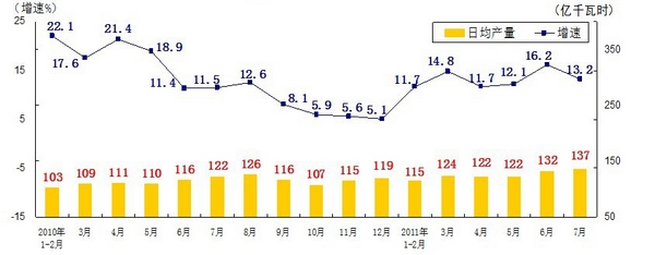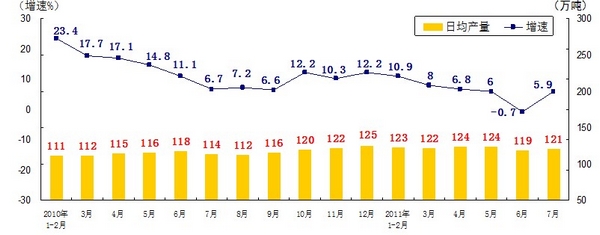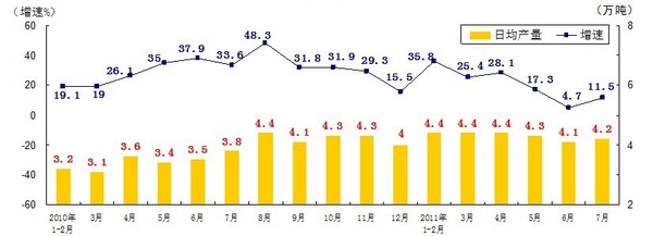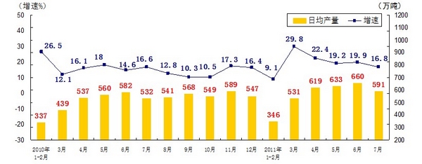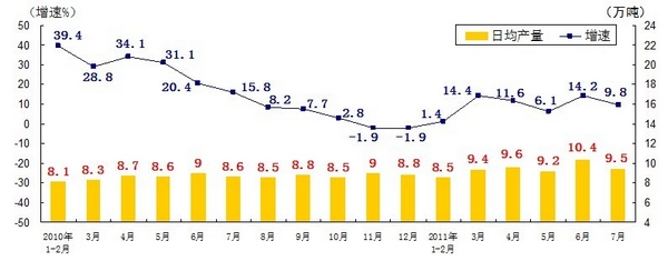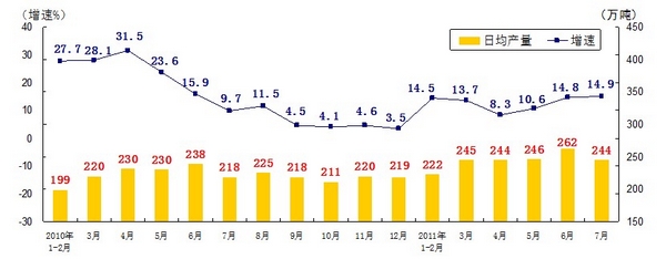分產(chǎn)品看,7月份,468種產(chǎn)品中有381種產(chǎn)品同比增長。其中,發(fā)電量4252億千瓦時(shí),日平均發(fā)電量137億千瓦時(shí),增長13.2%;鋼材7572萬噸,日平均產(chǎn)量244萬噸,增長14.9%;水泥18308萬噸,日平均產(chǎn)量591萬噸,增長16.8%;原油加工量3749萬噸,日平均產(chǎn)量121萬噸,增長5.9%;十種有色金屬293萬噸,日平均產(chǎn)量9.5萬噸,增長9.8%;乙烯130萬噸,日平均產(chǎn)量4.2萬噸,增長11.5%;汽車131.8萬輛,日平均產(chǎn)量4.3萬輛,下降1.3%;轎車77.7萬輛,日平均產(chǎn)量2.5萬輛,增長12.6%。(參見附圖)