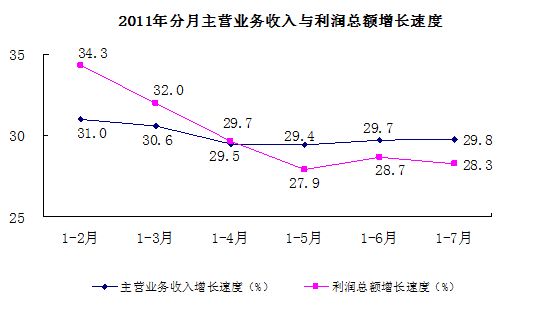2011年分月主營業(yè)務(wù)收入與利潤總額增長速度統(tǒng)計圖。(國家統(tǒng)計局)
