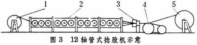 卷線:將鋼絲線盤,重新卷在捻股機(jī)的工字輪上;也可將鋼絲從拔絲機(jī)后直接卷到工字輪上;捻股:將鋼絲捻成繩股。捻股機(jī)有筐籃式、軸管式、無管式和雙捻機(jī)等。圖3為12軸管式捻股機(jī)示意圖,1是裝下層繩股的工字輪,2是旋轉(zhuǎn)的機(jī)筒,內(nèi)裝12個(gè)卷滿鋼絲的工字輪,3是成股的壓線瓦,4是牽引輪,5是上層繩股的收線輪,機(jī)筒旋轉(zhuǎn)一周,牽引輪引出的繩股長度即為股的捻距。