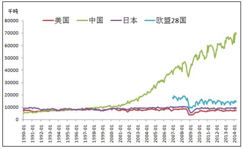 中國(guó)是鋼鐵生產(chǎn)大國(guó),粗鋼產(chǎn)量在全球遙遙領(lǐng)先。自2002年開始中國(guó)開始進(jìn)入經(jīng)濟(jì)飛速發(fā)展時(shí)期,粗鋼產(chǎn)量一直保持高速增長(zhǎng),到2013年粗鋼產(chǎn)量已達(dá)7.7億噸,約占全球產(chǎn)量的49.1%。美國(guó),日本等鋼鐵生產(chǎn)大國(guó),其對(duì)鋼鐵的需求已經(jīng)放緩,粗鋼產(chǎn)量一直保持穩(wěn)定狀態(tài),所以粗鋼產(chǎn)量的增長(zhǎng)大部分來(lái)自于中國(guó)。(見(jiàn)圖1)