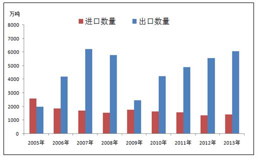 近幾年,中國(guó)鋼鐵的進(jìn)口很穩(wěn)定波動(dòng)不大,出口處于穩(wěn)健增長(zhǎng)狀態(tài)。出口量增加的原因一是因?yàn)榻?jīng)濟(jì)危機(jī)后各國(guó)經(jīng)濟(jì)都在緩慢復(fù)蘇中,主要經(jīng)濟(jì)體制造業(yè)景氣表現(xiàn)出現(xiàn)回升,2014年上半年全球制造業(yè)PMI指數(shù)平均值為52.58,達(dá)到了近兩年來(lái)相對(duì)高位的水平。另外新興經(jīng)濟(jì)體對(duì)國(guó)家基礎(chǔ)設(shè)施建設(shè)和民用建筑的投資不斷增大,對(duì)鋼材的需求明顯增加;二是中國(guó)鋼材價(jià)格相較于其他出口國(guó)較為低廉,且近期鋼價(jià)仍在不斷下跌,這增強(qiáng)了中國(guó)鋼材在國(guó)際貿(mào)易市場(chǎng)上的競(jìng)爭(zhēng)力。2014年上半年,中國(guó)出口量為3930.37萬(wàn)噸,同比增加1038.37萬(wàn)噸,同比增幅為35.9%。(見(jiàn)圖2)