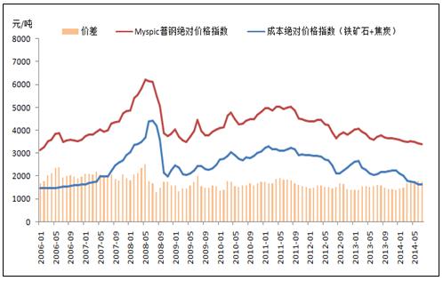 鋼鐵行業(yè)的原材料主要是鐵礦石和焦炭,近期原材料和鋼材的價(jià)格一直處于下跌狀態(tài)。截止2014年8月12日中國(guó)的焦炭絕對(duì)價(jià)格指數(shù)為931.8元/噸,同比下降19.33%;鐵礦石的絕對(duì)價(jià)格指數(shù)為699元/濕噸,同比下降27.55%;Myspic普鋼絕對(duì)價(jià)格指數(shù)為3380.68元/噸,同比下降9.8%,原材料價(jià)格下降速度遠(yuǎn)大于鋼鐵。