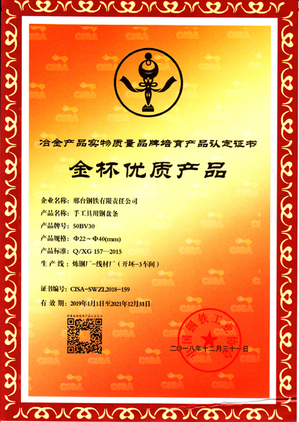 Recently, China Iron and Steel Industry Association held the 2019 annual meeting on brand cultivation of iron and steel industry. During the meeting, the metallurgical products which meet the requirements in brand cultivation of metallurgical products and reach the international level of similar products were named as “Gold Cup Quality Products for Metallurgical Products”. The φ22-40mm wire 50BV30 for hand tools of our company obtained the quality certificate of Gold Cup Quality Products for Metallurgical Products.