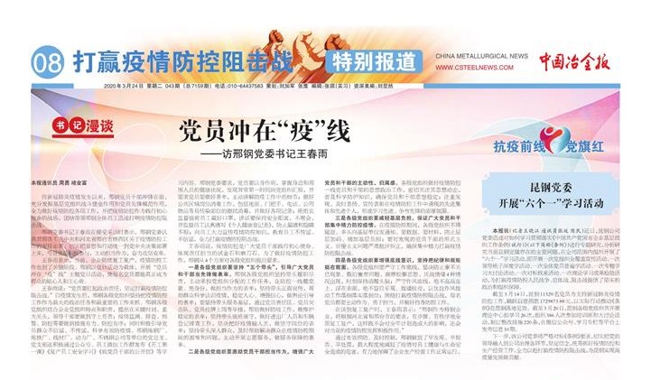 自新冠肺炎疫情發(fā)生以來(lái),邢鋼黨員干部沖鋒在前,充分發(fā)揮基層黨組織戰(zhàn)斗堡壘作用和黨員先鋒模范作用,全力做好疫情防控各項(xiàng)工作,并把疫情防控作為踐行初心使命的戰(zhàn)場(chǎng),團(tuán)結(jié)帶領(lǐng)邢鋼全體員工迅速打響疫情防控阻擊戰(zhàn)。