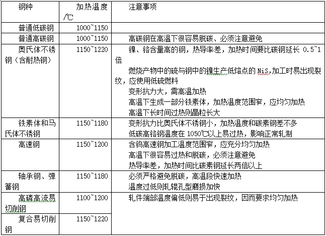 特別注意的是:對于碳鋼加熱溫度一般不能大于1300℃,大于此溫度,其一,鋼坯表面的氧化鐵皮會熔化(純氧化鐵皮的熔點為1377~1565℃,含有雜質(zhì)時降到1300~1350℃),從鋼表面上掉下來,露出新的表面,燒損迅速增加。其二,當加熱溫度大于1300℃時,鋼坯很有可能會出現(xiàn)過熱或過燒。生產(chǎn)其它鋼種時更應該注意最高加熱溫度。