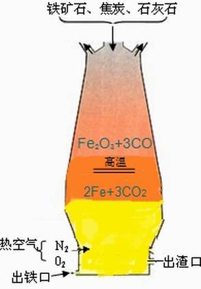 高爐生產(chǎn)時,從爐頂裝入鐵礦石、焦炭、造渣用熔劑(石灰石),從位于爐子下部沿爐周的風(fēng)口吹入經(jīng)預(yù)熱的空氣。在高溫下焦炭中的碳同鼓入空氣中的氧燃燒生成的一氧化碳和氫氣,在爐內(nèi)上升過程中除去鐵礦石中的氧,從而還原得到鐵。煉出的鐵水從鐵口放出。