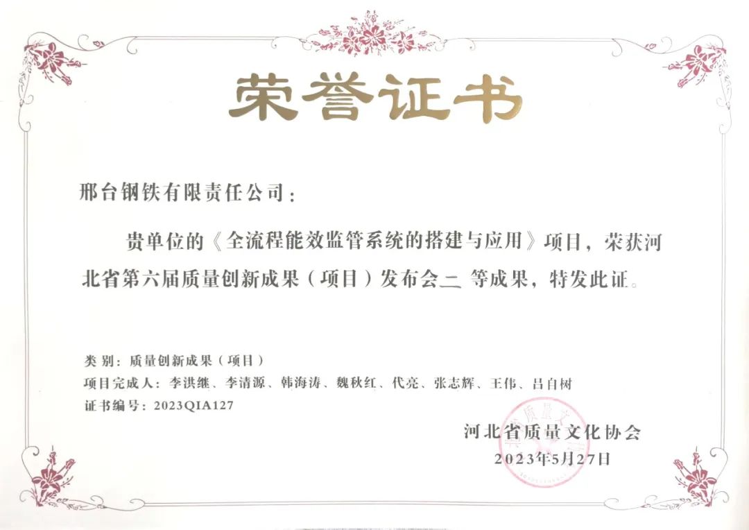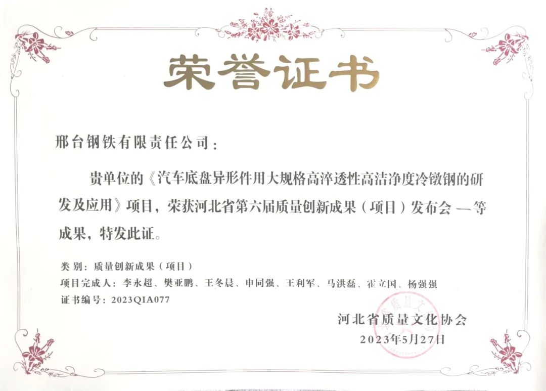 從近日召開的河北省第六屆質(zhì)量創(chuàng)新成果(項目)發(fā)布會上獲悉:邢臺鋼鐵有限責任公司(以下簡稱邢鋼)再次斬獲多項省級質(zhì)量創(chuàng)新成果殊榮,其中:《汽車底盤異形件用大規(guī)格高淬透性高潔凈度冷鐓鋼的研究及應用》、《提高超低碳鋼成品碳含量≤50ppm比例》、《優(yōu)質(zhì)碳素鋼拉拔斷裂問題的改善與研究》榮獲示范級質(zhì)量創(chuàng)新成果;《提高6#高爐生鐵產(chǎn)量》和《全流程能效監(jiān)管系統(tǒng)的搭建與應用》榮獲專業(yè)級質(zhì)量創(chuàng)新成果;《降低成品線材擦劃傷率》榮獲改進級質(zhì)量創(chuàng)新成果。