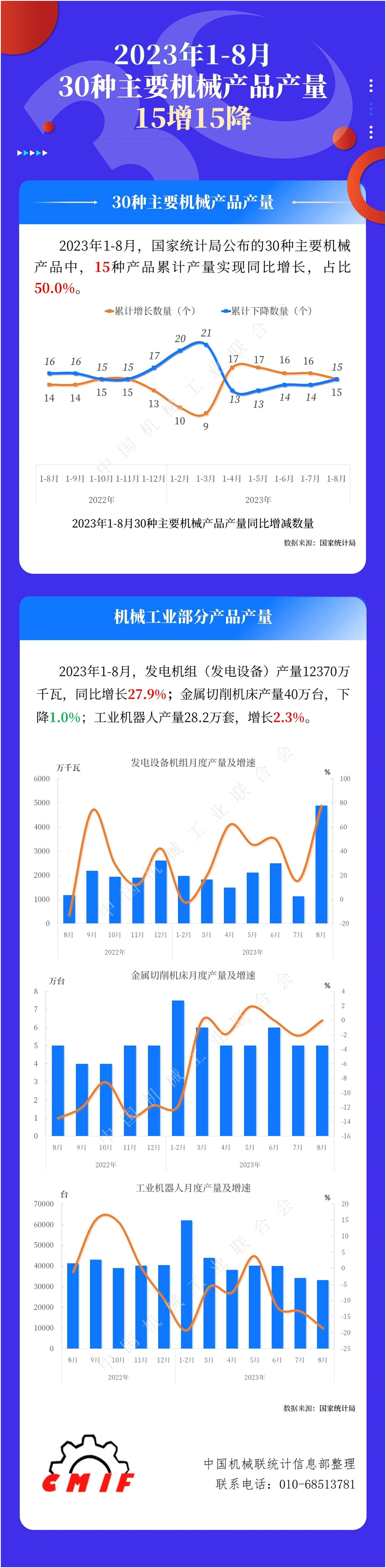 2023年1-8月,國家統(tǒng)計(jì)局公布的30種主要機(jī)械產(chǎn)品中,15種產(chǎn)品累計(jì)產(chǎn)量實(shí)現(xiàn)同比增長,占比50.0%。