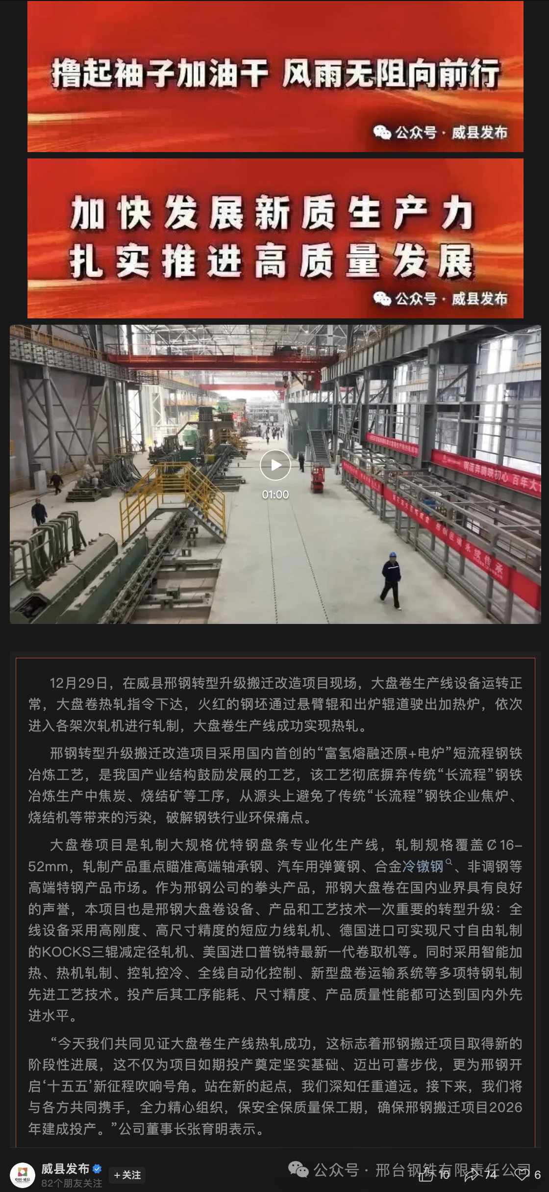 “今天我們共同見證大盤卷生產(chǎn)線熱軋成功,這標志著邢鋼搬遷項目取得新的階段性進展,這不僅為項目如期投產(chǎn)奠定堅實基礎、邁出可喜步伐,更為邢鋼開啟‘十五五’新征程吹響號角。站在新的起點,我們深知任重道遠。接下來,我們將與各方共同攜手,全力精心組織,保安全保質量保工期,確保邢鋼搬遷項目2026年建成投產(chǎn)。”公司董事長張育明表示。